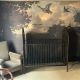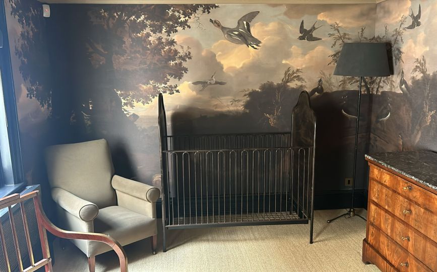 Statement French fabric wallpaper hand-installed to create a luxurious and textured feature wall in the principal bedroom